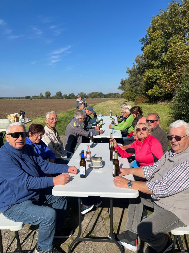 Bei herrlichem Sonnenschein ging es entlang der Saale durch Wölkau und Kreypau in Richtung Trebnitz. Unterwegs war sichtbar, dass der Herbst Einzug gehalten hat. Wir bestaunten die Herbstfärbung und die regelrecht leuchtenden Hagebutten und anderen Früchte an den Büschen und Bäumen. In Trebnitz legten wir die erste Pause ein, mit Zeit für Getränke und Gespräche. Die Sonne im Rücken ging es weiter Richtung Neumarktbrücke, von dort zur Schleuse Meuschau. Auch unterwegs wurde die Gelegenheit für angeregte Gespräche ausgiebig genutzt. Vorbei am späteren Mittagsrastplatz fuhren wir noch eine Runde durch die Luppeaue durch Lössen, Löpitz und Luppenau, bevor wir uns in der Nähe von Meuschau am Rand eines kleinen Wäldchens zur Mittagspause niederließen. An diesem schönen, sonnigen Platz ließen wir uns die wie immer bestens vorbereitete Mittagsverpflegung schmecken- Leckeres vom Grill, Fischbrötchen und eine Vielfalt an Getränken – es fehlte an nichts.