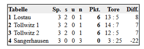 Am Ende des ersten Turniertages lagen die Teams von Lostau, Tollwitz 1, Tollwitz 2 mit 6 Punkten gleichauf, ausschlaggebend für die Rangfolge war das Torverhältnis.