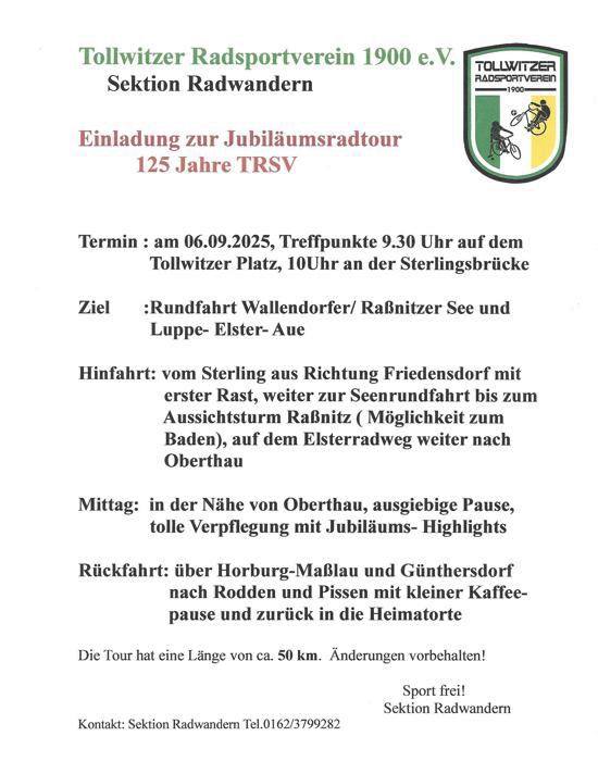 Am 06.09.2025 starteten sage und schreibe 37 Radbegeisterte zur 4.Radtour. Diese Tour stellte einen weiteren Höhepunkt anlässlich des 125-jährigen Jubiläums unseres Vereins dar. Es waren erfreulicherweise alle Sektionen und auch alle Altersgruppen vertreten! Punkt 10 Uhr ging es von der Sterlingsbrücke aus in Richtung Wüsteneutzsch und Friedensdorf und weiter nach Wallendorf. Dort machten wir die